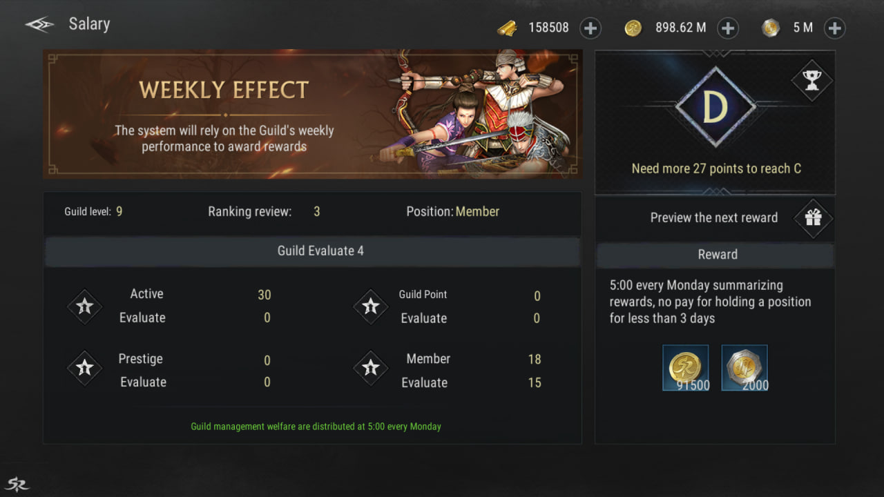 Increase guild salary by tier. The amount of gold received increases based on the Guild’s level |