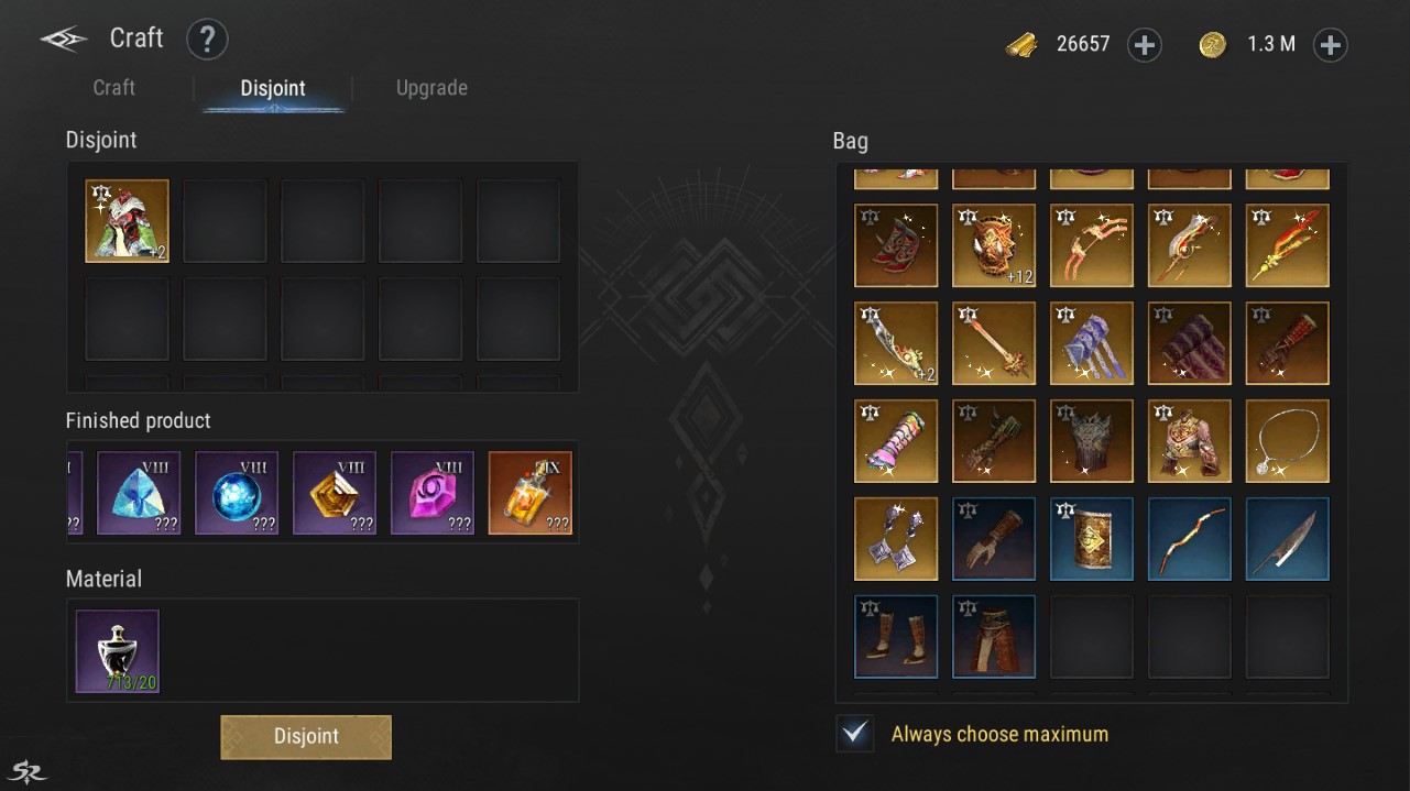 - Excess equipment can be disjointed into special materials through the Disjoint Equipment feature.